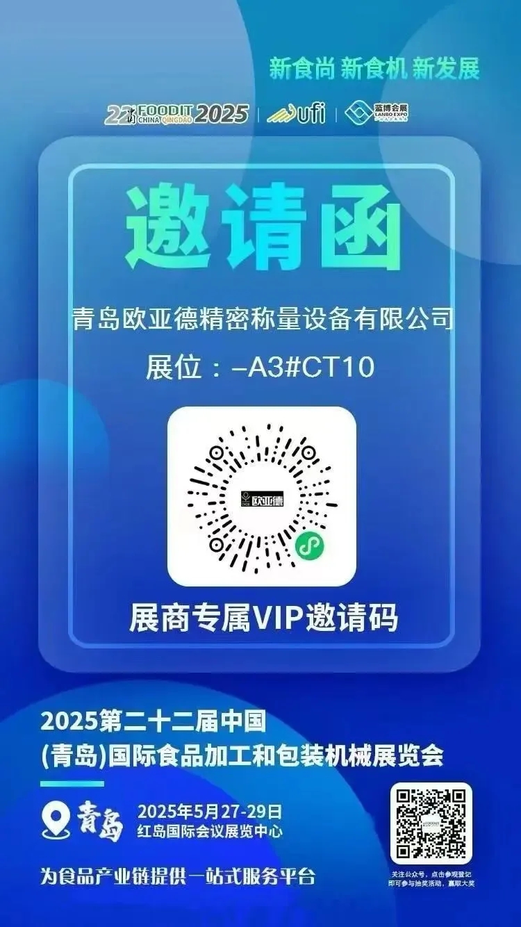 2025年5月27日-29日,第二十二屆中國(guó)(青島)國(guó)際食品加工和包裝機(jī)械展覽會(huì),將在青島市紅島國(guó)際會(huì)議展覽中心開(kāi)幕。食品機(jī)械展會(huì)在山東青島已連續(xù)舉辦21屆,已成為國(guó)內(nèi)食品裝備行業(yè)專業(yè)的供需平臺(tái),期待食品行業(yè)各位合作伙伴與青島歐亞德再次匯聚青島。 此次展覽面積約有13000平米,國(guó)內(nèi)外2500+優(yōu)質(zhì)展商,150000+專業(yè)觀眾蒞臨現(xiàn)場(chǎng)洽談采購(gòu)。屆時(shí)青島歐亞德將攜帶料盒式分級(jí)秤、電腦多頭組合秤、箱體檢重秤、袋裝檢重秤等升級(jí)產(chǎn)品重磅亮相,誠(chéng)邀各位新老顧客與行業(yè)伙伴前來(lái)參觀交流!